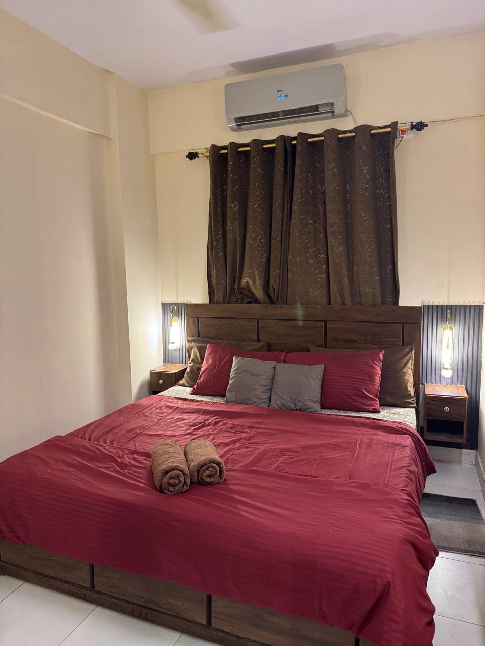 Welcome to Scarlet Loft – a bold, stylish retreat on the 4th floor (front, with lift). Featuring deep red walls, black furnishings, and warm lighting, this apartment is perfect for travelers seeking a cozy yet modern vibe. Enjoy a queen bed with plush bedding, AC, high-speed Wi-Fi, a fully equipped kitchen, and a modern bathroom. With 24/7 caretaker support, CCTV, and parking, it’s ideal for business guests, families, or groups.