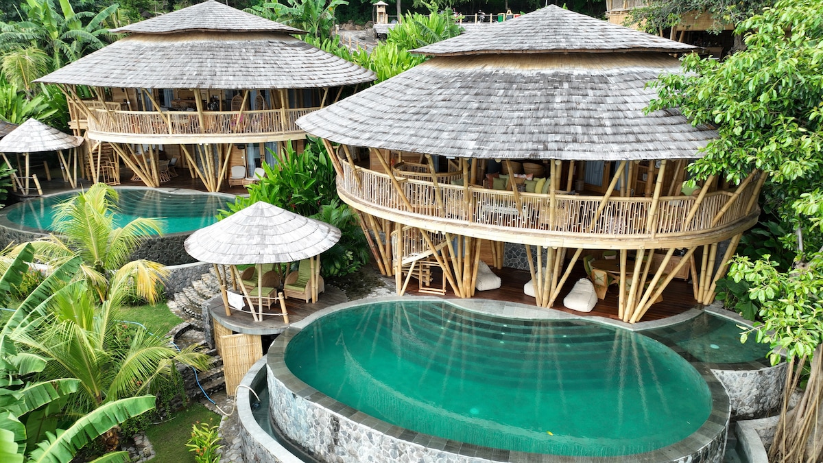 Agung 's Nest by KOSAY Bali Escápate a nuestro refugio único de bambú, ubicado en medio de la impresionante belleza del este de Bali. Un lugar lejos de las multitudes, donde cada detalle armoniza con la naturaleza. Despierta con el majestuoso monte Agung, ya que te encuentras encerrado en una exuberante vegetación. Sumérgete en nuestra piscina infinita o simplemente relájate en medio de este paraíso perfecto. Ven, experimenta la magia de Bali con nosotros, un lugar donde realmente te conectarás con el alma de la isla ”.