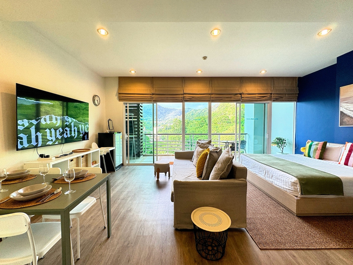 Moderno apartamento de 70 m² – Veloche Group, Karon Beach (6ª planta) Relájate con estilo en este espacioso apartamento de un dormitorio en el edificio de palmeras, Karon Beach, Phuket. Ubicado en la 6.ª planta, con refrescantes brisas de montaña y vistas parciales al mar de Andamán, es la base ideal para unas vacaciones en la playa o una escapada de trabajo remoto.