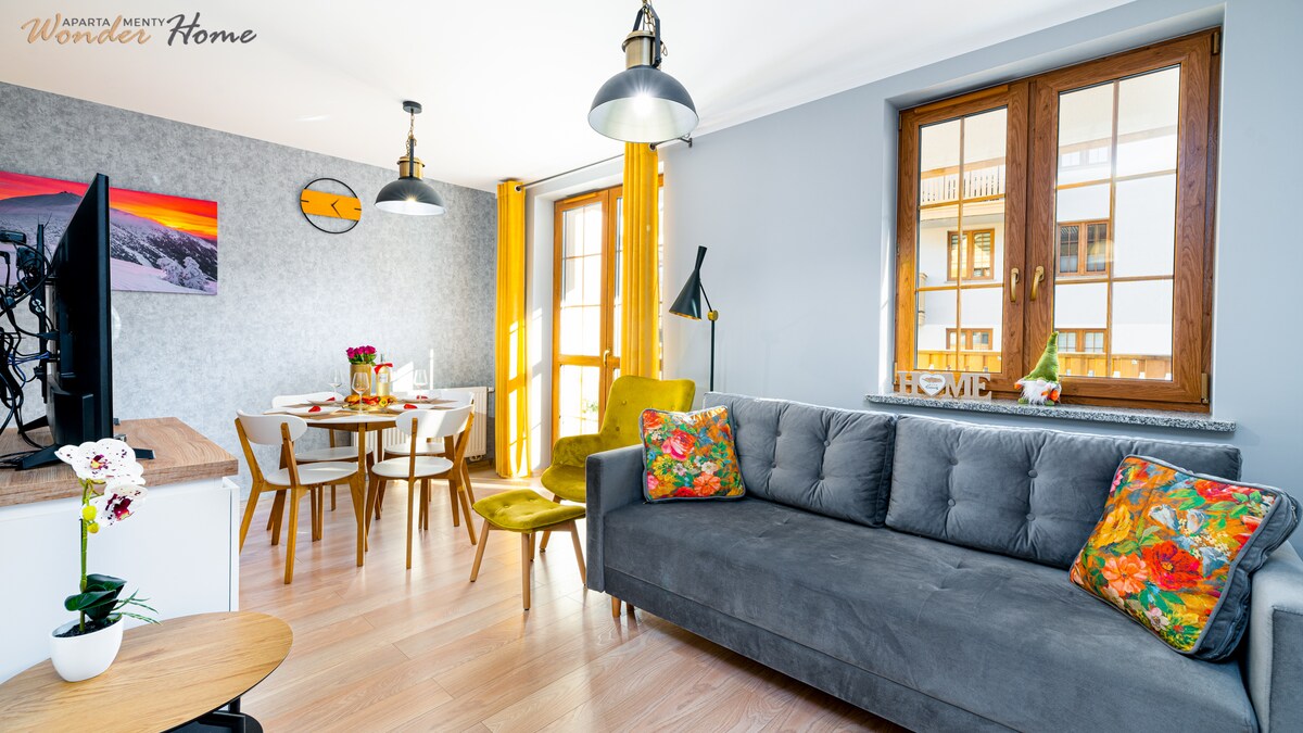 Ekskluzywny apartament 70 m² z sauną w apartamencie i wyjściem na ogród w nowej willi ze złotym widokiem na Karkonosze ze wszystkich okien. Ogromny taras (40 m²) idealny do relaksu. Salon ze świetnie wyposażoną kuchnią i rozkładaną sofą do spania. Sypialnia z prywatną łazienką i wysokiej jakości materacem. Dwie łazienki w najwyższym standardzie. Spokojna, malownicza okolica. Blisko sklep, restauracje, szlaki i atrakcje Szklarskiej Poręby. Miejsce parkingowe z ładowarką do aut elektrycznych.