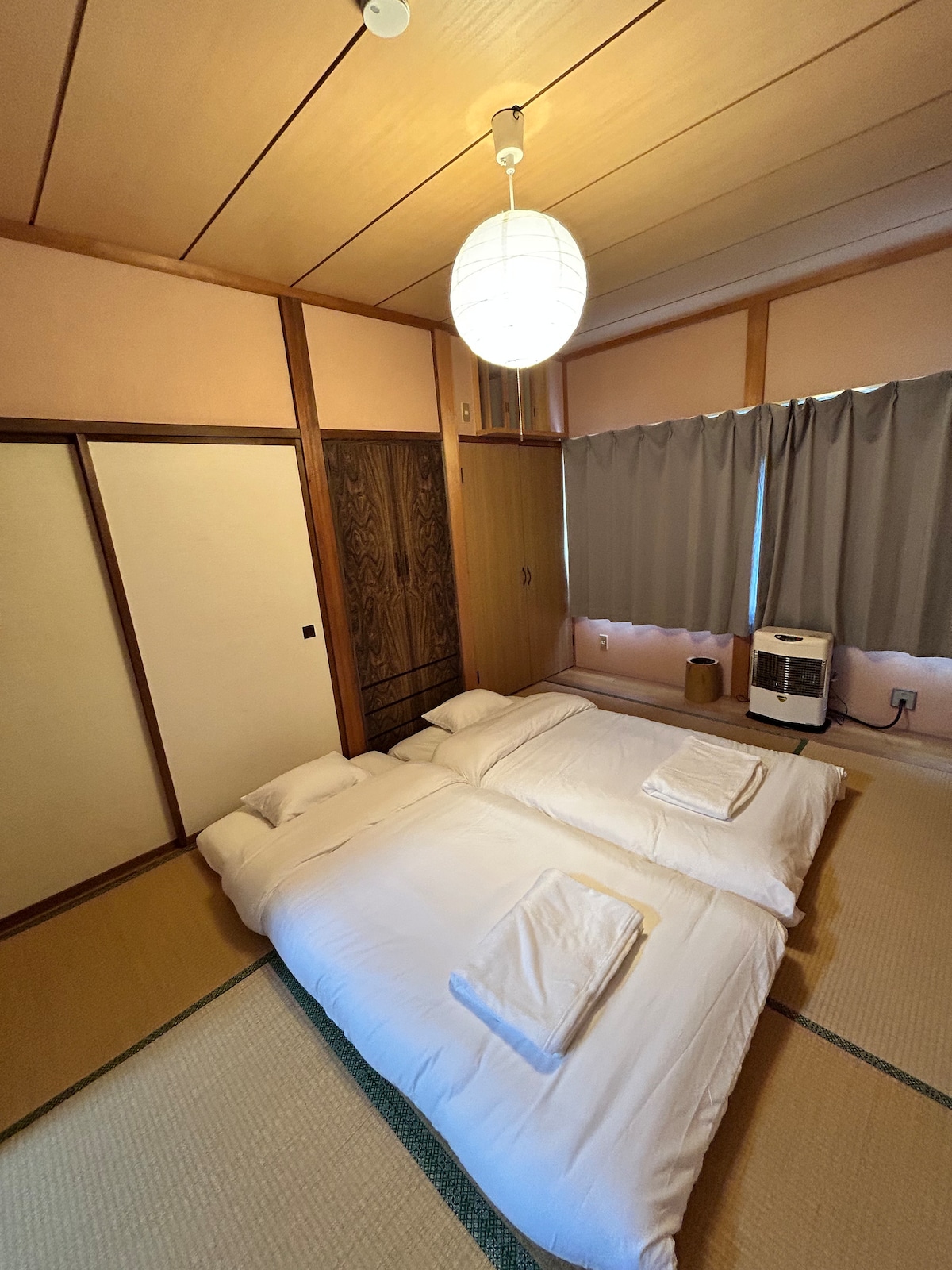 Amplio, iluminado y tranquilo en un bungalow.Hay 8 habitaciones de estilo japonés tatami y 2 dormitorios semidobles con camas semidobles.La habitación de estilo japonés se puede utilizar como dormitorio para colocar futones. Una espaciosa casa de huéspedes adyacente a la casa del anfitrión con mucha luz. Hay una habitación Tatami que se puede utilizar para una sala de estar y/o un dormitorio y otra habitación con 2 camas de tamaño completo. Un baño privado y una entrada privada para los huéspedes. Hay una linda cocina equipada con un fregadero, caldera de agua eléctrica, nevera y microondas. La sala de estar está equipada con aire acondicionado y calentador de espacio.