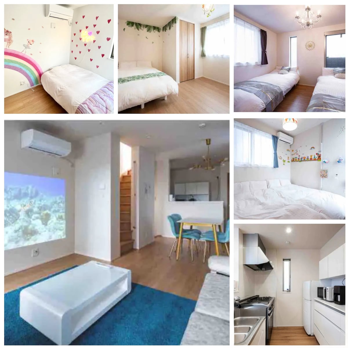 独栋别墅 3间客房+2个独立卫浴+客厅+厨房+餐厅 最多可入住7人,适合3-7人家庭或朋友一起出游。 民宿生活配套简直无敌。 1 楼入门,鞋柜里有称重秤、雨具等生活用品。有行李箱放置处,大件行李不必搬至楼上卧室。 2 楼主卧26㎡,带独立卫浴还有洗衣机和开放式厨房,厨具齐全,想大展厨艺完全没问题。 3 楼有两个卧室,分别为15㎡和 12㎡,家庭分房住一点不拥挤。 周边设施及交通: 步行1 分钟就是sunny超市,24 小时营业,可随时补货且扔可回收垃圾。 交通也超便利,从福冈机场出发 30 分钟就能到民宿。机场出口左转直走坐免费巴士到博多,换乘地铁七隈线到别府站 3 号出口,过红绿灯直行看到九大… ゼ三大楼右转就到,门口鸟饲 5-10-1 的标识特别醒目。周边出行也方便,步行 5 分钟就能到地铁站,坐地铁能直达博多、天神商圈,购物逛吃完全不用愁。 路口西侧肉铺现切和牛,回民宿厨房煎烤,人均百元就能实现和牛自由。要是想偷懒,出门西行 30 秒就是乌冬面馆,热汤手打面暖胃又好吃。路口东侧咖啡店隔壁的和风西餐厅,日式洋食精致感拉满。西行 100 米还有人气烧肉屋,顶级和牛烤起来油脂香爆表。
