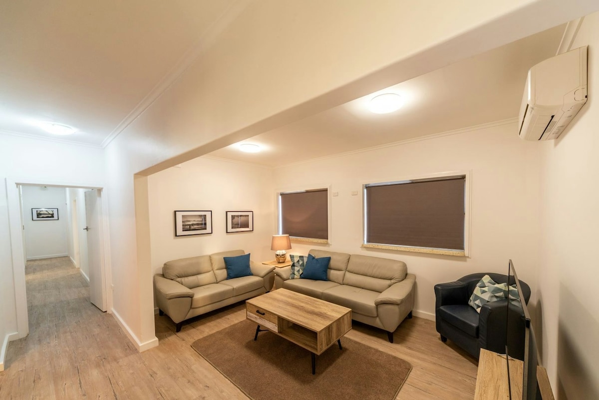 Newly refurbished and decorated. This apartment consists of 4 bedrooms (2 double rooms and 2 single rooms), all with built in robes and RC air-conditioning. Kitchen has dishwasher, cooktop, microwave and full size fridge with dining area. Lounge room has RC air conditioning with TV and FREE Wifi. Outside is a spacious private balcony with BBQ and outdoor setting. Bathroom has separate toilet, shower and washing machine. Parking for multiple vehicles at the end and 1 undercover park.