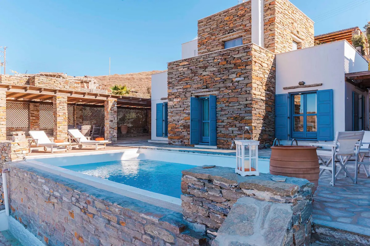 Lujosa villa de piedra con vistas al mar y piscina en Kea