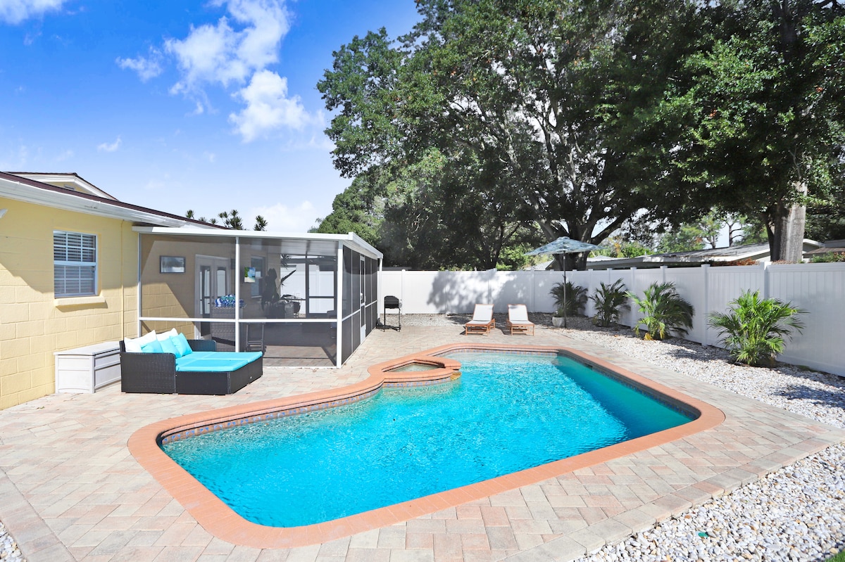 ✨ Bienvenido a tu elegante escapada a Florida: piscina climatizada, ambiente de resort y entretenimiento sin fin✨ Retiro de St. Pete diseñado con amor para la comodidad y la conexión. Disfruta de una piscina privada, una acogedora chimenea, un cine al aire libre, una mesa de billar y una máquina de karaoke para divertirte sin parar. Disfruta de bebidas tropicales de la máquina de margaritas y relájate en lujosas duchas de lluvia. Con una decoración elegante, una cocina totalmente equipada y un bar de café/té, cada detalle se creó cuidadosamente para que te sientas como en casa.