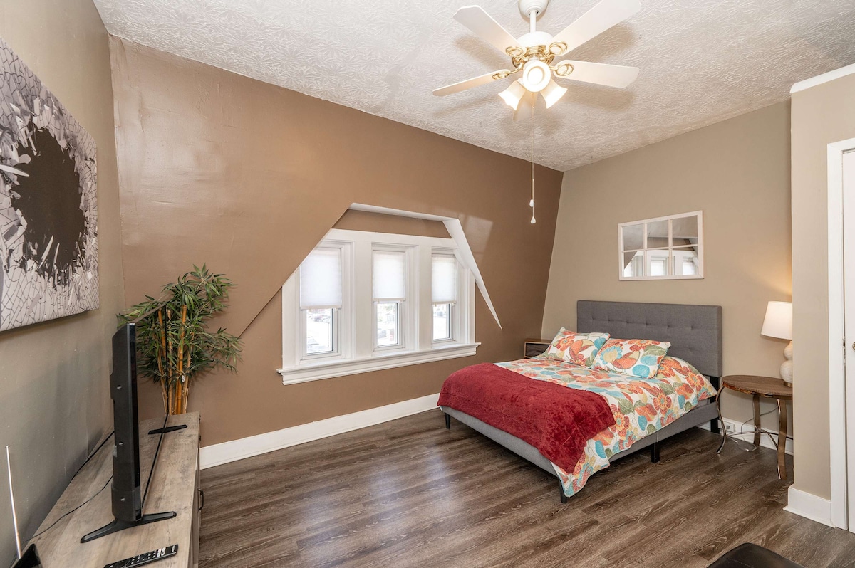 Spacious 2BR townhome with skyline views, free parking, and walkability to dining, bars, Paycor Stadium, Great American Ball Park, and the Convention Center. Sleeps 6 with 2 queen bedrooms plus sleeper sofa downstairs. Features full kitchen, laundry, and WiFi. Guests love the clean, updated space and prime location for games, concerts, and downtown events.