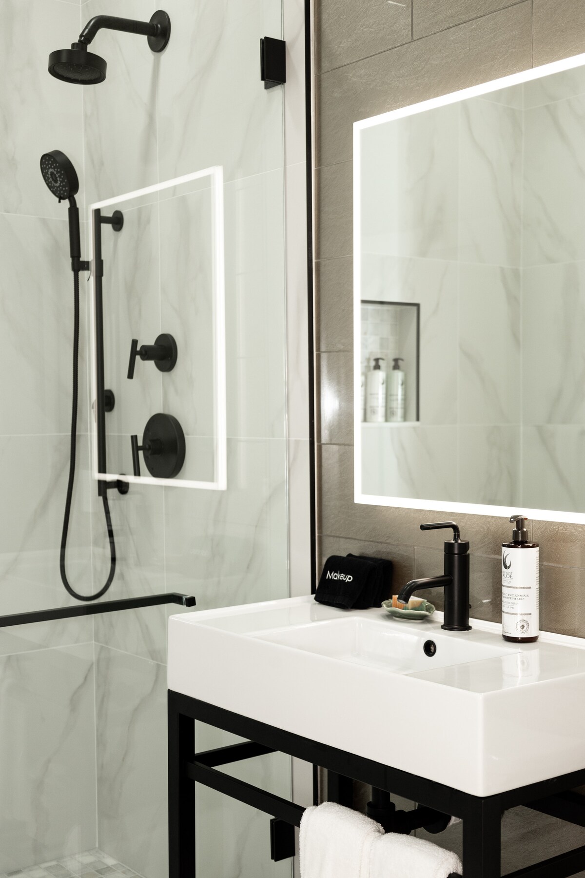 Disfruta de 910 pies cuadrados de vida tropical moderna en esta suite de lujo de dos niveles de 2 dormitorios. Los dormitorios de arriba cuentan con camas queen con la parte superior acolchada, escritorios de trabajo, amplios armarios y baños separados inspirados en el spa, uno con ducha a ras de suelo que incluye un cabezal de ducha de efecto lluvia y el otro con bañera de tamaño completo. ¡La suite incluye una sala de estar en la planta baja que viene con un cómodo sofá cama tamaño queen, tocador para huéspedes y área de lavandería con lavadora y secadora + vista a la piscina!