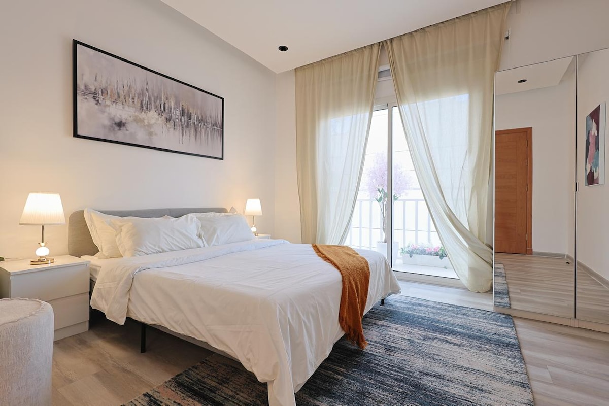 Apartamento de lujo con un estilo moderno y elegante 🌻🍃 Equipado con las últimas posibilidades y dispositivos modernos, contiene una lujosa pantalla de 75 pulgadas, y consta de tres amplios dormitorios, un cómodo salón y una mesa de comedor, además de una cocina totalmente equipada con lavadora, y se caracteriza por la entrada independiente que te hace disfrutar de la privacidad y el acceso cuando quieras, y se encuentra en una zona céntrica, cerca de la mezquita, el jardín del barrio (Park Square), y la calle comercial, que contiene todas las necesidades del turista, incluyendo restaurantes, tiendas, lavanderías y otros servicios, bienvenido a tu segundo hogar 🦩