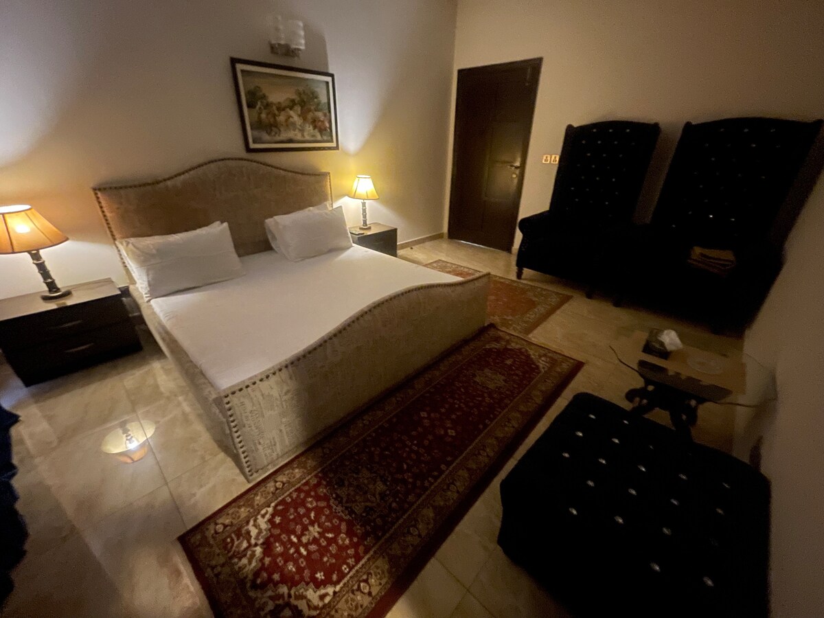 🛏️ Dormitorios: 5 habitaciones espaciosas y totalmente amuebladas con suelos de madera, cómodas camas y armarios, mininevera, aire acondicionado reversible y TV LED Sala de🛋️ estar y comedor: 2 elegantes salones con cómodos sofás y una elegante TV LED con NETFLIX y mesas de comedor. 🍽️ Cocina Cocina totalmente equipada con fogones, microondas y utensilios. 🛁 Baños: Baños limpios con agua caliente y toallas limpias 📍 Ubicación: cerca de F-11 Markaz, mezquita, parque 📶 Wifi y servicios básicos: Wifi de alta velocidad, aire acondicionado, calefacción.