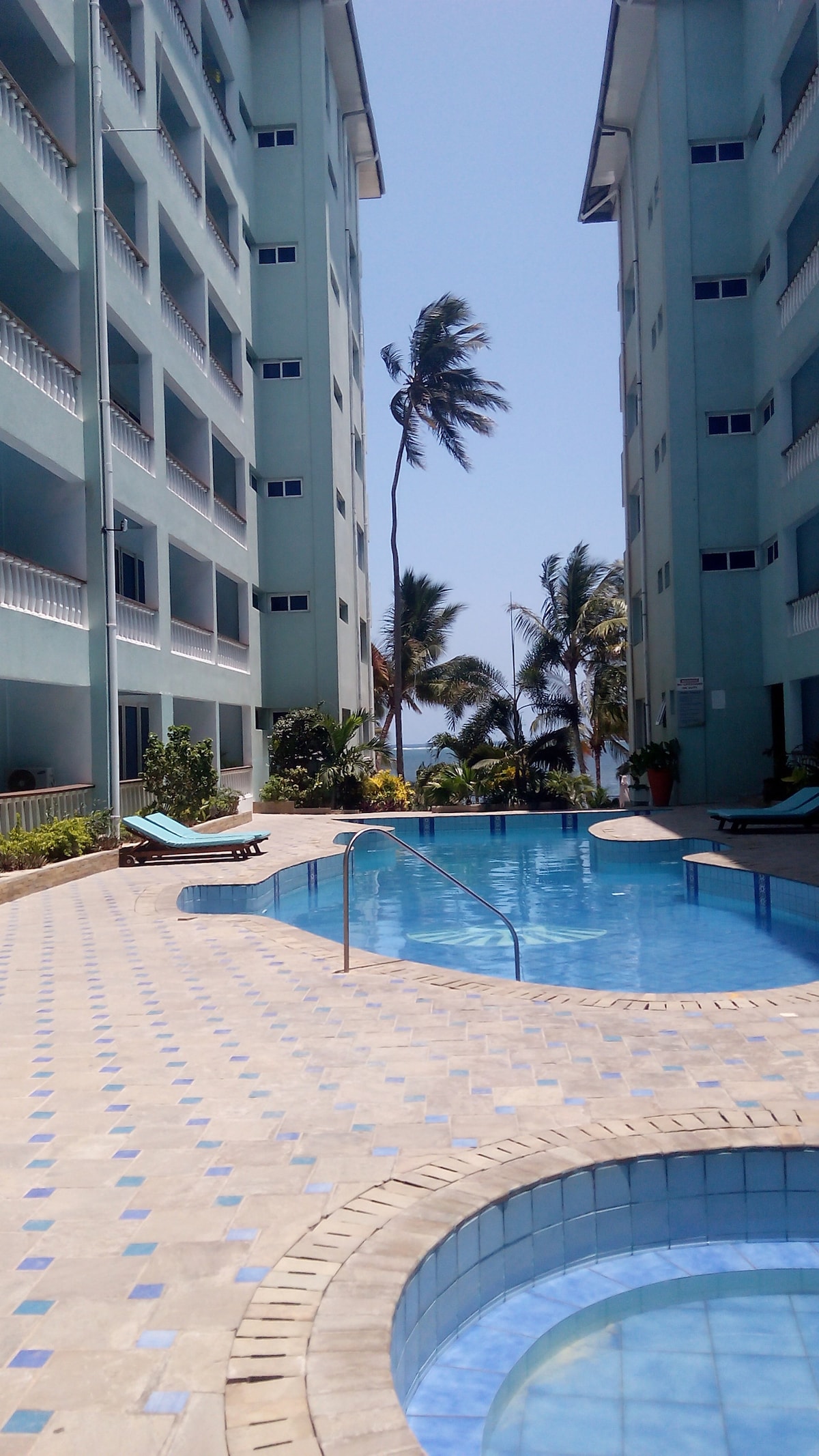 Acogedor apartamento estudio con servicios (Bamburi) amueblado. * Adecuado para 2 adultos y 1 niño o 3 adultos, amueblado con una cama tamaño queen y una cama individual. * Incluye aseo diario. * Mesa de comedor con cuatro sillas, sofá, mesa de centro. * Aire acondicionado *TV * Caja fuerte con llave * Balcón con dos sillas y mesa de centro * Cocina: nevera, microondas, hervidor de agua, cafetera, tostadora, vajilla y cubiertos. * Acceso a servicios: piscina, zona de juegos para niños, bar de playa, restaurante, gimnasio, playa, lavandería. * A 21 km del aeropuerto internacional de Moi. * A 26 km de SGR Mombasa.