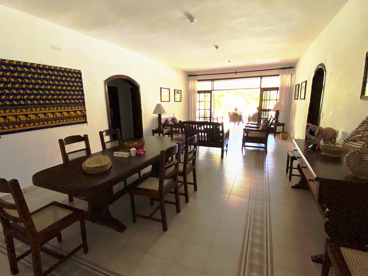 Casa de estilo suajili tradicional, se encuentra en el promontorio de coral con vistas al mar, playa, hermosos jardines de flores, acceso privado a la playa. Piscina instalada recientemente, VER NORMAS DE LA CASA La villa tiene 2 niveles y vistas al océano Índico, acceso directo privado a la playa, que se extiende a ambos lados, dentro del Parque Marino. Incluye 3 empleados, cocinero y servicio diario a la habitación, y jardinero. Capacidad para 10 personas. Se adapta fácilmente y se hace cómodo para alojar grupos más pequeños, utilizando solo los dormitorios de arriba.