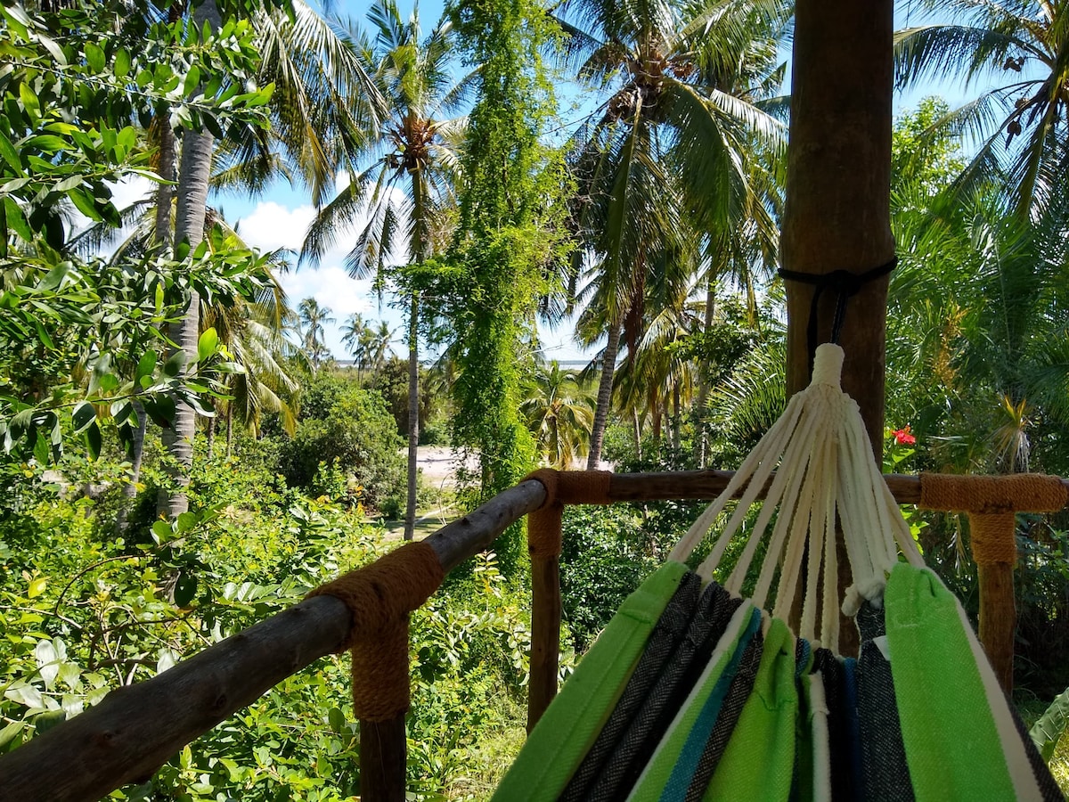 Enjoy a peaceful stay in our tropical bungalow in Utende village on Mafia Island, Tanzania. Surrounded by coconut trees and lush garden, the bungalow is just 10 minute walk to the beach and diving centers. The room includes AC, Wi-Fi, min fridge, and a walk-in bathroom with skylight. Relax on your private terrace with a hammock, enjoy coconut trees or garden view, refresh in the outdoor shower, spend the evening around the fire pit or enjoy drinks to our outdoor min bar. Breakfast is included.