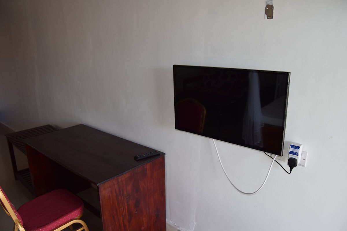 Habitación de hotel bien iluminada y muy limpia, muy grande, completa con cama tamaño queen, cafetera/tetera, sábanas limpias, TV con canal local y acceso a DSTV, baño muy espacioso con todos los equipos de cepillo de dientes, jabón, champú, secador de pelo, toallas limpias, también un sofá grande y una mesa de estudio.