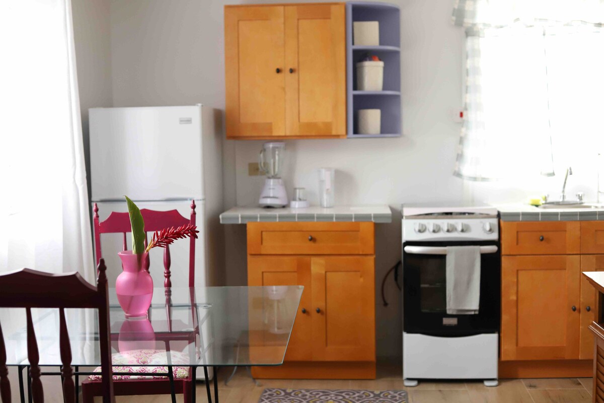 Maravillosa ubicación. Apartamento independiente y espacioso de un dormitorio con jardín, con una cama tamaño queen, cocina/comedor y baño. Cerca de algunos de los mejores restaurantes, cafeterías y supermercados de Kingstons. A cinco minutos a pie del hermoso Jardín Botánico y Zoológico Hope y a poca distancia en auto de la Universidad de las Indias Occidentales y la Universidad de Tecnología.