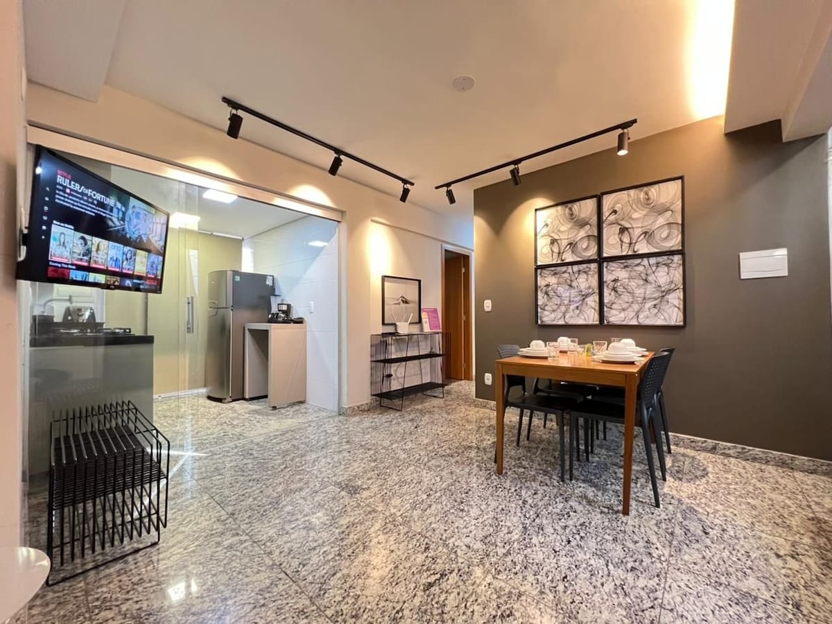 Apartamento moderno, 32m2, ubicado en el mejor punto de Sion. Cocina práctica con minibar, cocina, TV (canales abiertos/Netflix), aire acondicionado, secador de pelo, hervidor eléctrico e internet. Zona Sur, junto a la Plaza JK y la Avenida Bandeirantes, frente a un supermercado. Azotea del edificio con gimnasio, sauna, piscina, sala de estar y cocina comunitaria (agua, máquina de hielo). Limpieza a pedido disponible. Edificio seguro con conserjería las 24 horas. *No hay garaje incluido.