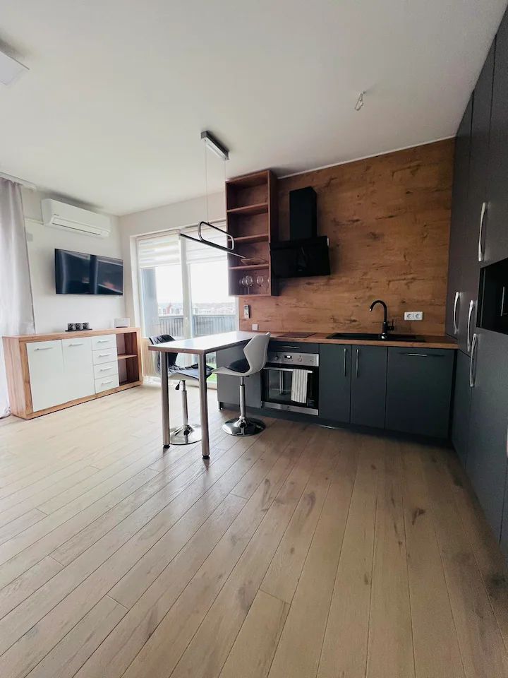 Gran y hermoso apartamento para tu estancia en Kunigiskes. Con un área protegida y un estacionamiento privado. Mi Jura 3. Estamos hablando en inglés, Deuch, Русский.