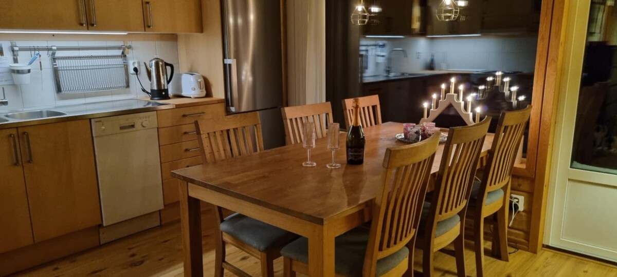 Equipo; los utensilios de cocina para al menos siete personas, siete sillas, se pueden insertar en la mesa de la cocina. Refrigerador con congelador, horno de calefacción de aire, microondas, lavavajillas (tabletas para lavavajillas disponibles), máquina de cápsulas de café nespresso, cafetera, plancha de gofres, plancha mack. Televisión (sin embargo, solo 1, 2 y canal infantil). Apple TV. Wifi. La cabaña se calienta con bomba de calor de aire y se ajusta el calor en la caja blanca que cuelga de la pared en la sala de estar. Trae ropa de cama, toallas y papel higiénico