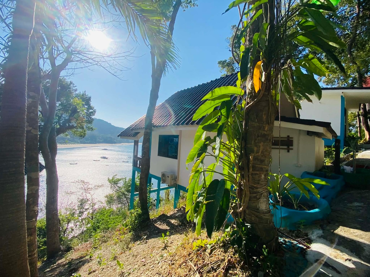 Un edificio de 2 plantas bellamente diseñado en estilo apto para una pareja romántica de vacaciones con vistas al mar con vistas a la playa y al mar de Andamán. (No apto para personas mayores o personas que tengan problemas con las juntas, debido a la ubicación cuesta arriba). Este alojamiento está restringido a solo 2 personas. No se pueden agregar camas o cunas adicionales. No es apto para niños.