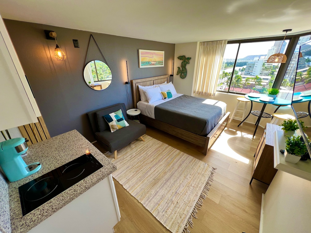 A one-of-a-kind, beautifully renovated studio in a PRIME Waikiki location, just a 5-min walk to the beach. Designed with a chic, elegant aesthetic, this studio features refined finishes, curated textures, and a modern, sophisticated ambiance throughout. Thoughtfully styled for both comfort and style, it offers a seamless blend of luxury and functionality. Surrounded by top dining, shopping, and iconic Waikiki attractions, it’s perfect for couples or small groups seeking an elevated island stay.