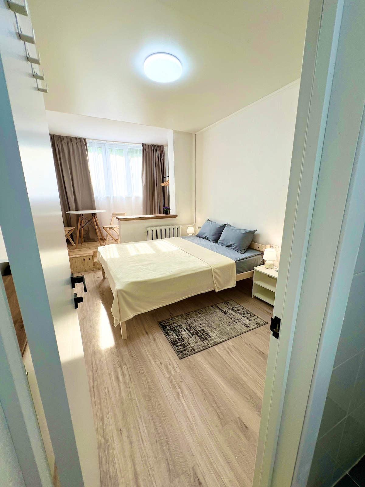 El estudio está situado en una zona turística y de negocios muy animada de la ciudad. A cinco minutos se encuentra la zona peatonal de Arbat, el colorido Zelenyi Bazar, el complejo de baños y spa Arasan, los parques más grandes de Almaty (el parque Panfilov y el parque Central) y muchos restaurantes y cafeterías. La habitación ha sido recientemente renovada, no es grande, pero es muy elegante y agradable. Hay todo lo necesario para una estancia cómoda. Muy tranquilo. Las ventanas dan a un patio verde. Alojamiento tranquilo en el centro de la ciudad.