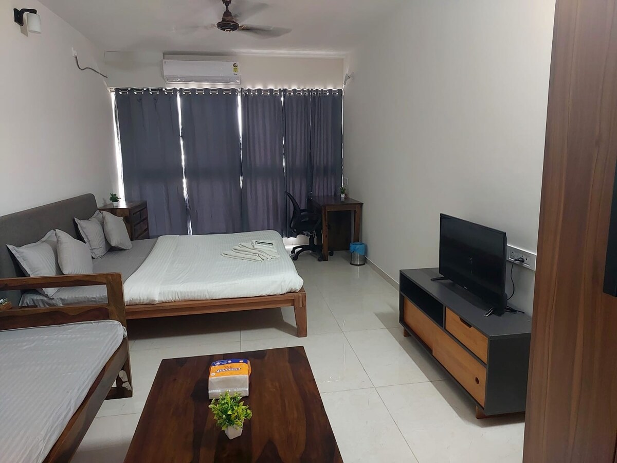 Alójate de lujo en nuestro apartamento de 1BHK totalmente amueblado, que ofrece un dormitorio acogedor, dos baños (un dormitorio adjunto, uno común ) y una cocina totalmente funcional con electrodomésticos y utensilios de cocina básicos. Relájate en la amplia sala de estar con un televisor inteligente grande y un elegante diseño interior. Disfruta de muebles de alta gama que crean un hogar lejos de casa. Perfecto tanto para estancias cortas como largas, este apartamento promete comodidad y conveniencia en una ubicación privilegiada en la ciudad. ¡Reserva ahora y disfruta de una estadía excepcional!