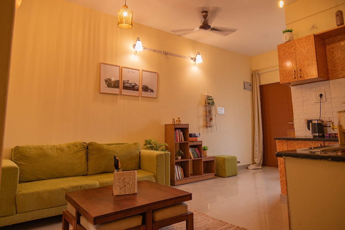 Amplia suite 1BHK de diseño de 600 pies cuadrados con balcón privado | Wifi de fibra óptica de alta velocidad y TV inteligente con plataformas de streaming, escritorio de trabajo/comedor, respaldo de energía las 24 horas, los 7 días de la semana para trabajo y comodidad ininterrumpidos | Cama tamaño king Luxe y colchón ortopédico, armarios de madera para almacenamiento | Cocina pequeña totalmente equipada | Sofá cama en la sala de estar , ocupación máxima 4 | Acceso al ascensor, servicio de limpieza profesional y acceso a lavandería de pago en el sitio para estancias largas | Ubicado en el centro de Bangalore | LGBTQIA++ Afirmativo