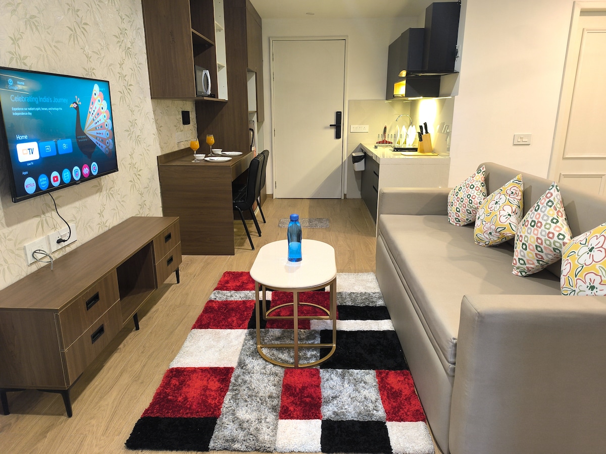 • Cómoda sala de estar: decoración moderna con una lujosa cama tamaño queen, un sofá y un rincón para comer. • Cocina totalmente equipada: perfecta para cocinar o disfrutar de un café por la mañana. • Servicios: wifi de alta velocidad, TV de pantalla plana y aire acondicionado. • Ubicación privilegiada: cerca del transporte público, tiendas y una vibrante vida nocturna. Ya sea que estés explorando las atracciones de Pune, saboreando la cocina local o simplemente relajándote, este estudio tiene todo lo que necesitas para una estancia inolvidable. ¡Reserva ahora para disfrutar de una escapada perfecta!