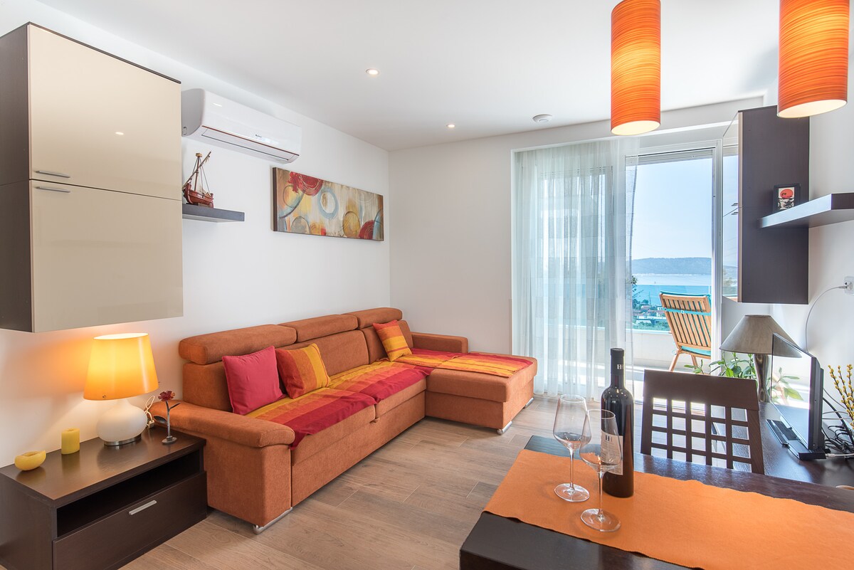El apartamento de 4 estrellas Harmony de nueva construcción está a solo 4 minutos a pie (300 metros) de la primera playa hermosa y del mar claro. El apartamento te ofrece una terraza de 16 m2 con vistas al mar, 2 dormitorios y 1,5 baños. Barrio tranquilo, pero a pocos pasos de cafeterías, restaurantes y tiendas de comestibles. Kastel Stari es el lugar perfecto para pasar unas vacaciones relajantes, pero a solo 15 minutos en coche de la encantadora ciudad de Trogir, declarada Patrimonio de la Humanidad por la UNESCO, y a 20 minutos en coche de Split. Kastela tiene 7 km de línea costera para explorar las 6 ciudades y playas de Kastela.