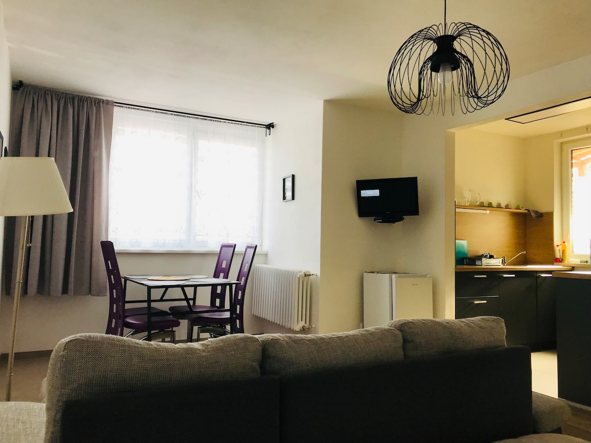 Stylové ubytování v Hustopečích u Brna v soukromí a klidu historického měšťanského domu ze 16. století uprostřed centra města. Ideální místo pro páry či rodinu s dětmi, které chtějí poznat krásy jižní Moravy v komfortu. Apartmán nabízí pohodlí pro 2 až 4 osoby na ploše 55 m². Prostorná obytná místnost s krbem a francouzskými okny spolu s manželskou postelí a možností dalších dvou lůžek. Součástí také plně vybavená kuchyň s myčkou a velkým kulatým jídelním stolem ideálním pro společné chvíle.
