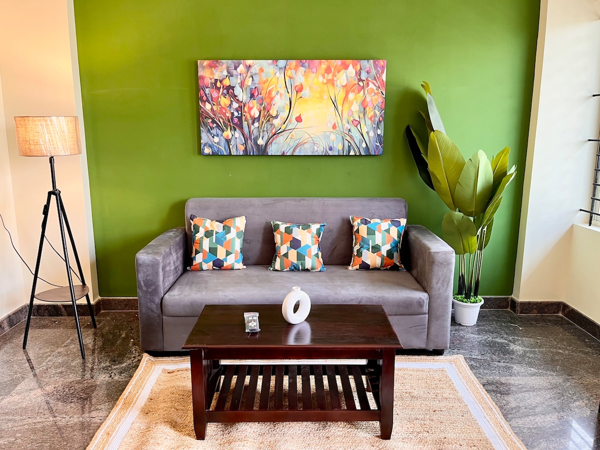 Bienvenido a tu acogedor retiro 2BHK cerca de Jayanagar, hecho a mano para la comodidad, la facilidad y un toque de calidez. Mantente fresco con aire acondicionado en un dormitorio y conectado con wifi de hasta 100 Mbps, ideal para trabajar y transmitir. Duerme profundamente en colchones de primera calidad con sábanas limpias y comienza el día con té y café de cortesía. Se proporcionan champú y gel corporal para que puedas empacar ligero. Además, disfruta de la comodidad del estacionamiento gratuito en el sótano. Si se trata de una estadía corta o una escapada más larga, tenemos a tu disposición.