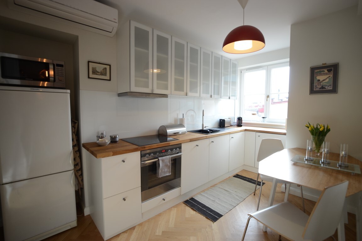 Apartamento de diseño clásico y vintage situado en el segundo piso de una casa histórica con vistas a la calle y al patio, sala de estar, cocina totalmente equipada, comedor, baño privado grande y dos dormitorios tranquilos, cada uno amueblado con una cómoda cama doble. Aire acondicionado, calefacción, Netflix, wifi, lavadora secadora y otros servicios para una estancia corta o larga en Cracovia.