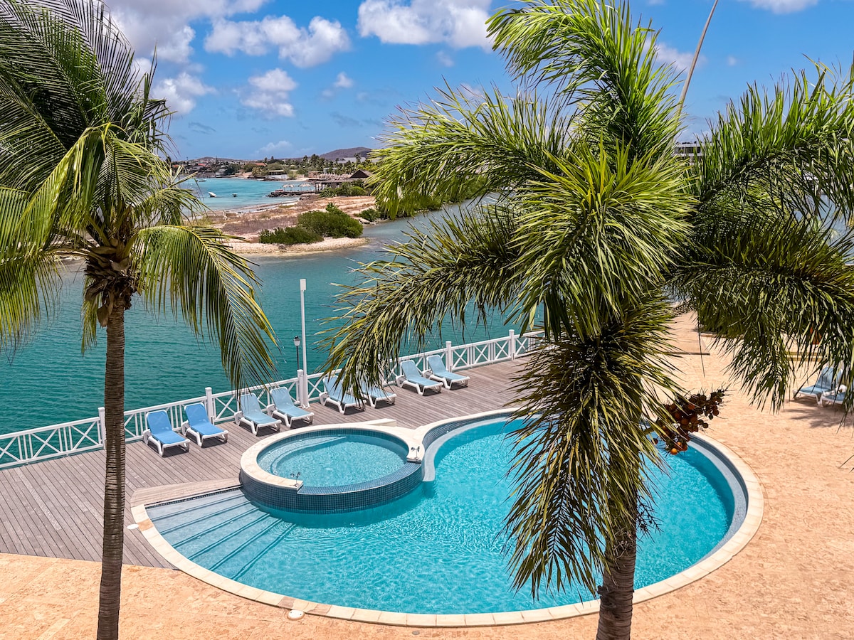 Este precioso apartamento está situado en el lujoso Port Bonaire, a la entrada del puerto deportivo de Plaza y junto a la playa de Te Amo. Hay 2 dormitorios, 2 baños, una cocina totalmente equipada, zona de estar con TV y un balcón donde podrás disfrutar de hermosas vistas y de los barcos que pasan. Hay una piscina comunitaria y una escalera que te da acceso directo al mar. Ideal para hacer snorkel o buceo. Junto a Port Bonaire hay una escuela de buceo.