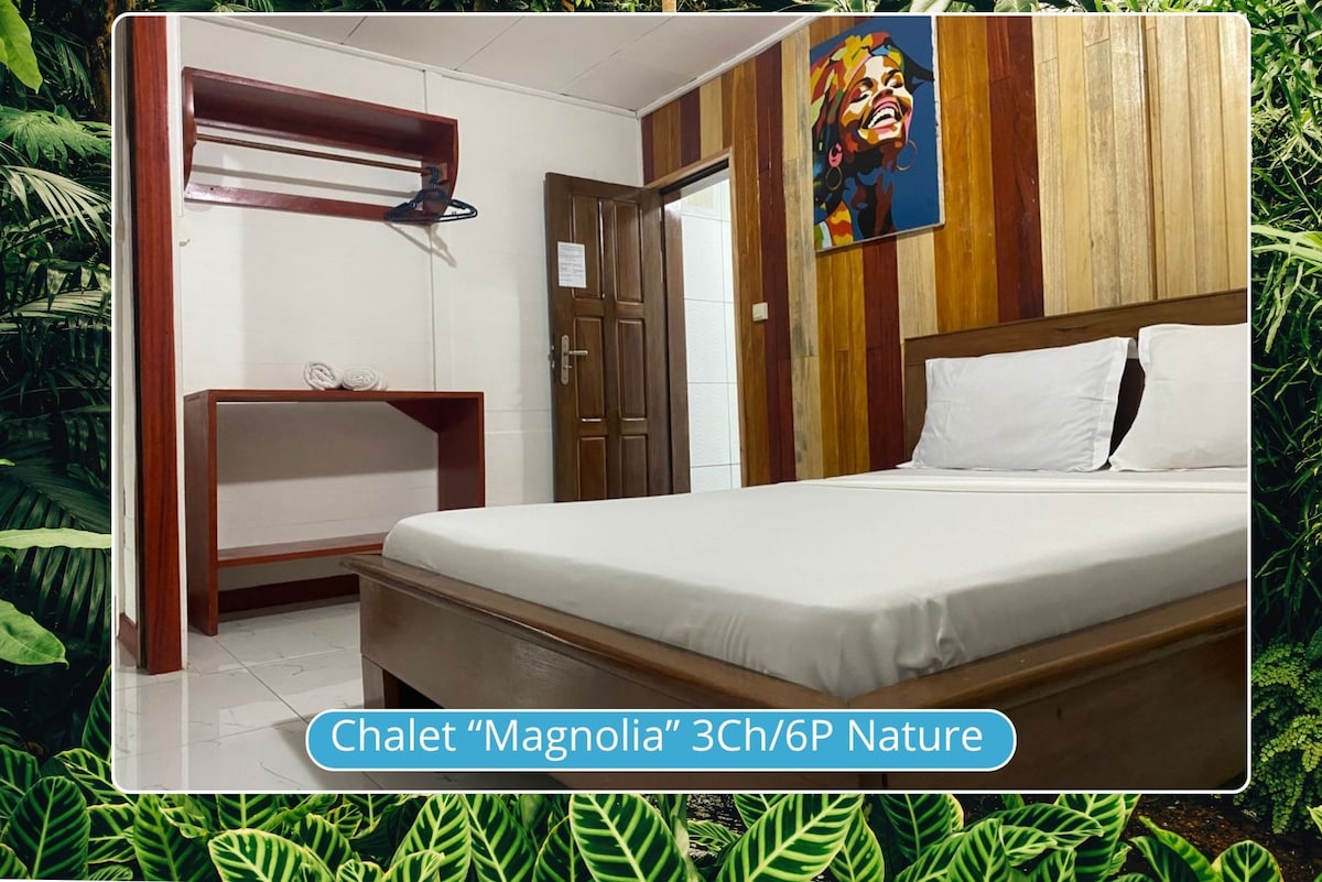 Les Chalets Familiaux des Gîtes de Kribi, construits en bois d’azobé, offrent un confort supérieur dans un environnement naturel paisible en bord de rivière. Idéals pour les familles nombreuses ou les groupes, ils disposent de trois chambres, d’un salon spacieux, d’une kitchenette et d’un balcon privé. 3 chambres (6 personnes) Grand salon convivial Kitchenette équipée Salle de bain moderne Climatisation Wi-Fi Balcon avec vue sur la rivière