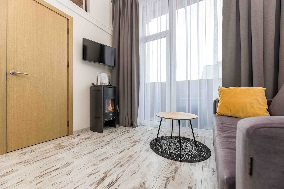 Apartamento tipo loft muy acogedor, único y exquisitamente diseñado con terraza privada y vistas panorámicas a la naturaleza. A 600 m. del mar: este es un gran lugar para parejas, familias que buscan privacidad y conexión con la naturaleza.Es un lugar donde el pulso de la ciudad se fusiona con la tranquilidad y brinda a los huéspedes una sensación excepcional de relajación de calidad.Los grandes ventanales panorámicos permiten admirar la naturaleza incluso estando en casa, y es agradable relajarse en la terraza, disfrutar de la paz y el aire fresco del mar.