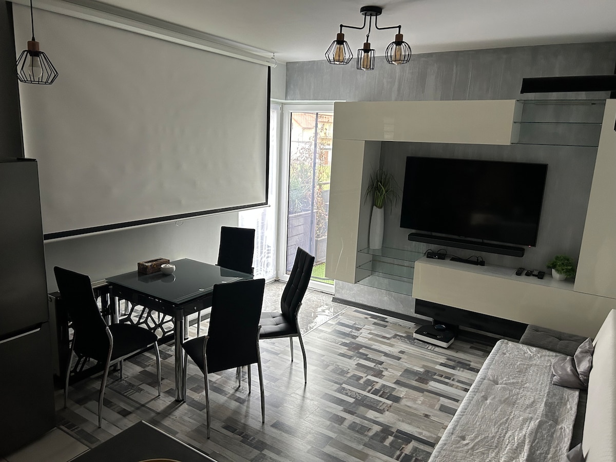 Alto nivel que incluye muebles modernos, TV 3D, proyector multimedia 3D, Internet (Wi-Fi) y una gran pista equipada con muebles de ratán (incluido el sofá y la mesa de la esquina) para descansar o comer. Cocina totalmente equipada con ollas, platos, cubiertos y lavavajillas. Secadora en el baño. Dos camas dobles pueden alojar a 2 huéspedes o 2 parejas. La finca es privada, muy tranquila a poca distancia a pie (10 minutos) del centro de la ciudad. Espacio de estacionamiento dedicado frente al edificio.