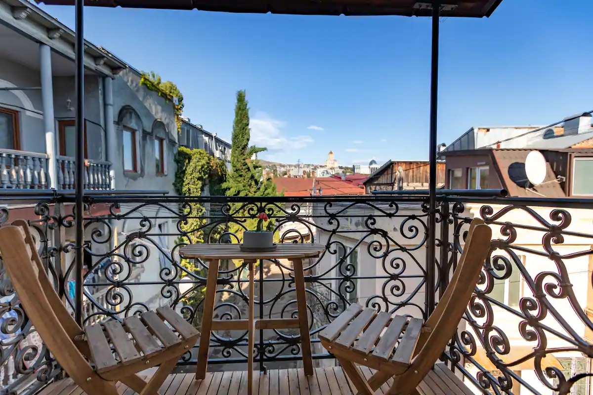 Esta propiedad se encuentra en uno de los primeros edificios históricos en el corazón del viejo Tiflis. Combina de manera única el encanto de un barrio centenario con el aspecto elegante y las comodidades de un hogar moderno y cómodo. Interior bellamente decorado, colorido y elegante, con ventanas en todos los lados que ofrecen excelentes vistas de toda la ciudad y un acogedor balcón con mesa y sillas para que disfrutes explorando la ciudad incluso desde casa. Alojamiento perfecto para familias, parejas, pequeños grupos de amigos.