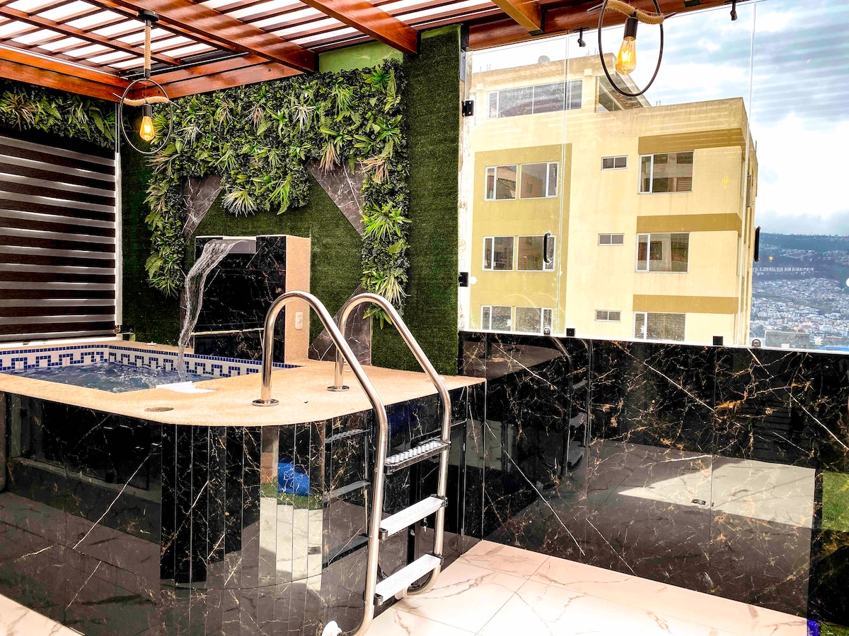 Este lugar es único y tiene su propio estilo minimalista, cuenta con espacios de lujo, si deseas pasar una noche romántica con tu pareja contamos con un jacuzzi privado, una gran vista en los diferentes ambientes, cama queen, área de bbq privada, chimenea con equipo de sonido Bluetooth, Internet Netlife, Television 65 in y Netflix, lavadora secadora privada LG Smart, Cortinas eléctricas, acceso electrónico seguro, ubicado en uno de los mejores sectores de Quito, No se permite Fiestas ni Mascotas