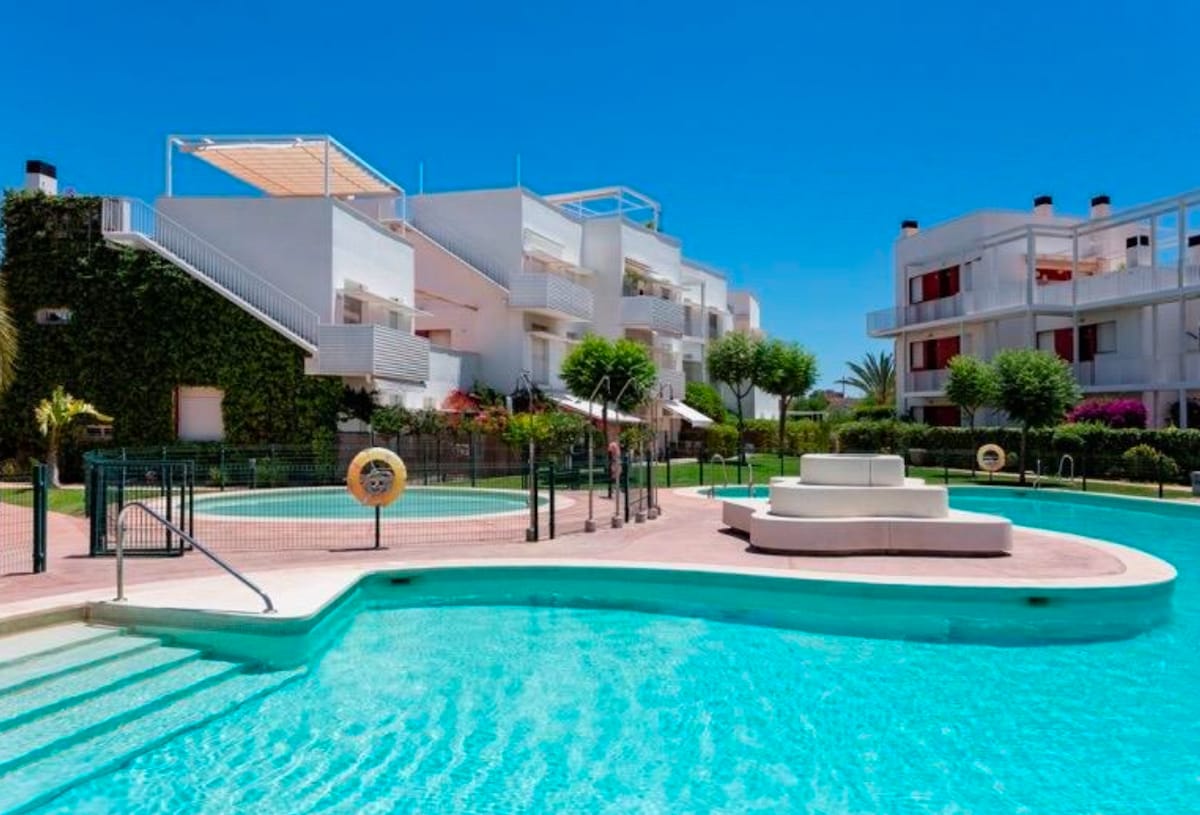 Residencial muy silencioso, con piscina y plaza de garaje, 2 habitaciones con cama de matrimonio, cuarto de baño con bañera y aseo con plato de ducha, cocina completa y salón comedor. Terraza con mesa y sillas, y lo mejor para el final... una terraza solárium, con zona chill-out, hamacas y pergola! Para pasar unos atardeceres inolvidables... Un apartamento con gusto y todos los detalles, cerca de la playa y chiringuitos. Pueblos turísticos a 4 min ,calas y playas virgenes cercanas