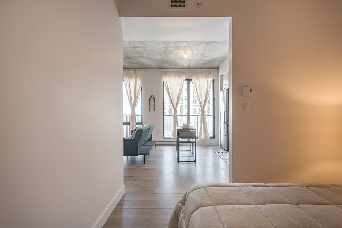 * Nouvelles internet Rapides. Ce studio lumineux et au design chaleureux avec ascenseur et près de tout. Nouvelle construction le Studio L'ELI-TE en plein coeur du Quartier des Spectacles et des activités de MTL. Accès Facile au Metro St-Laurent et Berri. Vous aurez la chance de séjourner dans un studio de 350 pied carré avec balcon privatif. Meublé et décoré au goût du jour parfait pour un séjour romantique en couple, le travail, ou simplement profitez de la belle ville de Montreal.