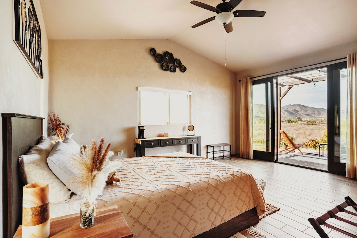 Hermosa y elegante Cabaña en @TerraMonarca, que ofrece hermosas vistas del Valle de Guadalupe. Ubicada dentro de una propiedad segura y privada en el corazon del Valle. Disfruta de un dia visitando Vena Cava, Concierto Enologico, Salvia Blanca, Once Pueblos, Finca Altozano y muchas mas Vinicolas y Restaurantes en la Ruta del Vino, despues regresa a tu hermosa habitacion con tu patio privado y tu fogata para recargar energia para un nuevo dia de Vino y diversion.