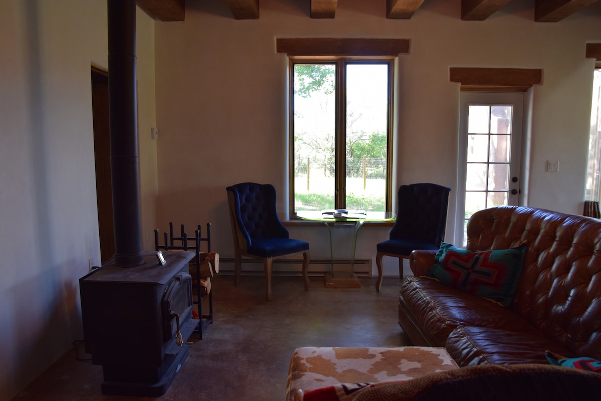 This cozy 2-story home sits on 10 acres in the Chama River Valley, with views of Cerro Pedernal and the mountains. Rustic, cozy, with all basic amenities. Ideal for the solo artist or couple. Hiking + hot springs nearby, including Ghost Ranch, Poshuouingue ruins & Ojo Caliente Springs! Most pets are welcome (for a pet fee). It's helpful to check in on it, however, due to our contained pups further back on the land. Open to longer stays at discounted price. Write about either to discuss!