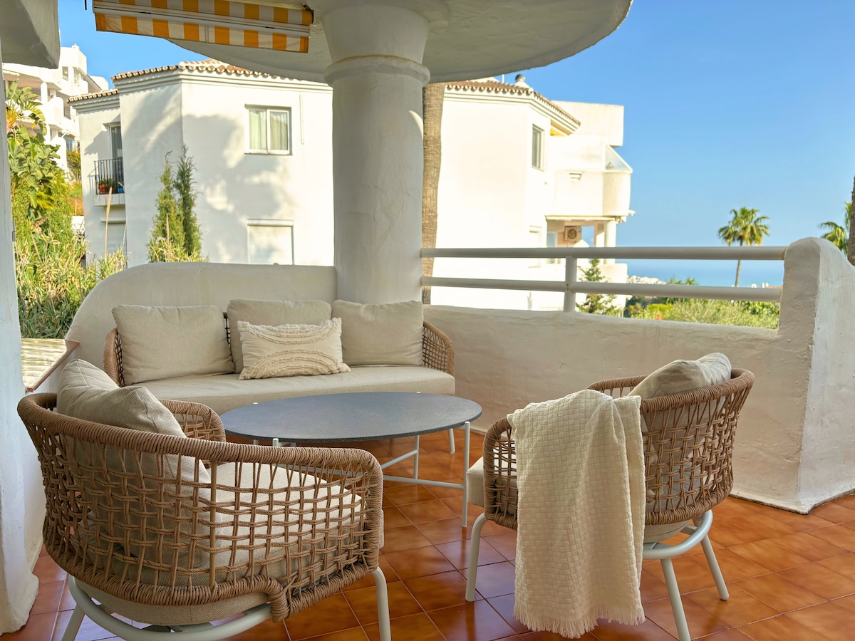 Luminoso y espacioso apartamento 2BR/2BA con vistas panorámicas al mar, una gran terraza soleada y barbacoa incorporada. Capacidad para 6 personas con un cómodo sofá cama. A poca distancia en coche de la playa, restaurantes y tiendas. Disfruta de una cena al aire libre, hermosas puestas de sol y un ambiente costero relajante. Ideal para familias, parejas o amantes del golf, cerca de los mejores campos de golf y un club pádel cercano. A solo 30 minutos del aeropuerto de Málaga. ¡La escapada perfecta a la Costa del Sol!