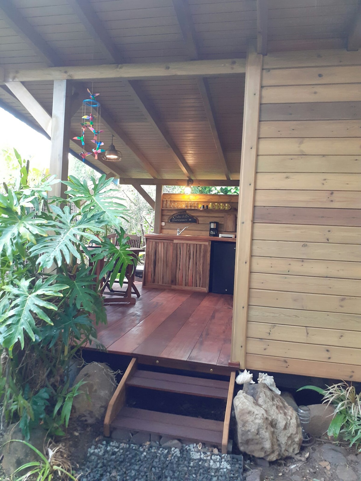 Tiny House encaramada en una colina a 400 metros de altitud en medio de un huerto frutal. accesible por un camino forestal en buen estado. Lugar tranquilo y aislado entre el mar y la montaña con una vista dominante. Alojamiento naturalmente fresco y ventilado sin mosquitos. Alojamiento ecológico. Situado a 10 minutos de la playa de Leroux a 20 minutos de la playa de Malendure a 20 minutos de la playa de Grande Anse Adecuado para personas que deseen desconectar, descansar o reponer energías.