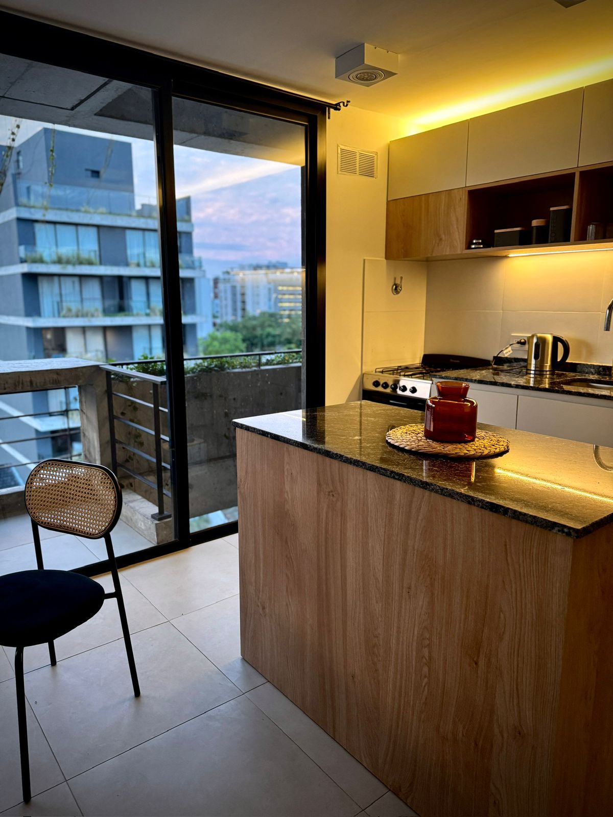 Disfrutá de este moderno loft en el 7º piso con balcón al frente, jardín vertical y barra para relajarte con vistas abiertas a la ciudad. Luminoso y totalmente equipado, cuenta con dos Smart TV (living y dormitorio), placard de pared con cajonera y perchero, cocina completa con lavarropas y WiFi de alta velocidad. Diseñado con estilo y confort, es ideal para estadías de trabajo, parejas o viajeros que buscan una experiencia única en la ciudad.