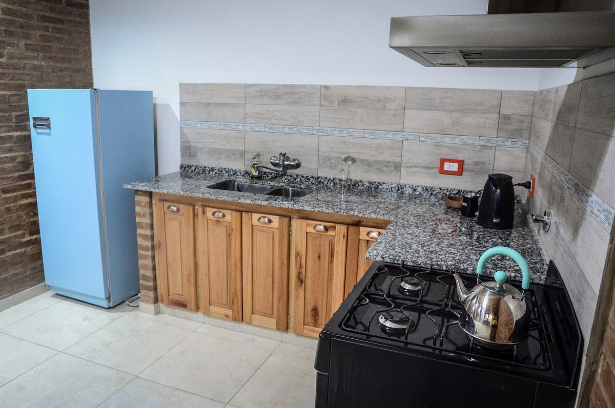 Acogedor departamento totalmente equipado. Cuenta con dormitorio con ropa de cama, baño privado con agua caliente y toallas, living comedor amplio con sofá cama y cocina integrada con lo esencial. Dispone de aire acondicionado en todos los ambientes y estacionamiento propio. Su patio con asador, bajo un caldén centenario, ofrece un entorno único y natural. Ubicación accesible, ideal para descanso o trabajo.