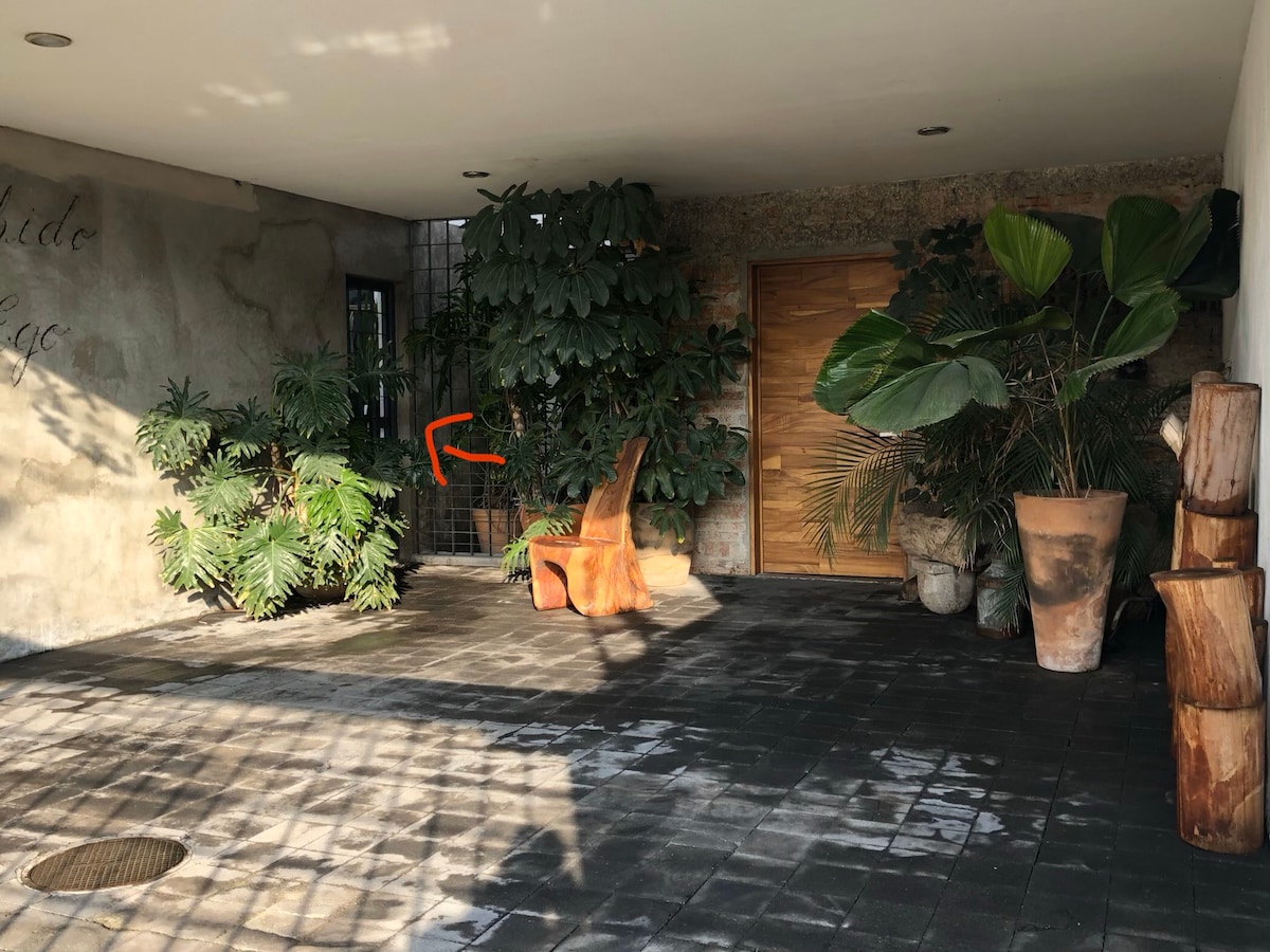 Disfruta de la comodidad de este "Estudio" tranquilo y céntrico. Ubicado en la parte trasera de mi casa con entrada independiente. Equipado con aire acondicionado, WiFi, Smart TV, además cuenta con estacionamiento cerrado y gratuito dentro de las instalaciones. Hay un patio grande y 2 terrazas compartidas en donde sí se permite fumar. La cama es tamaño matrimonial.
