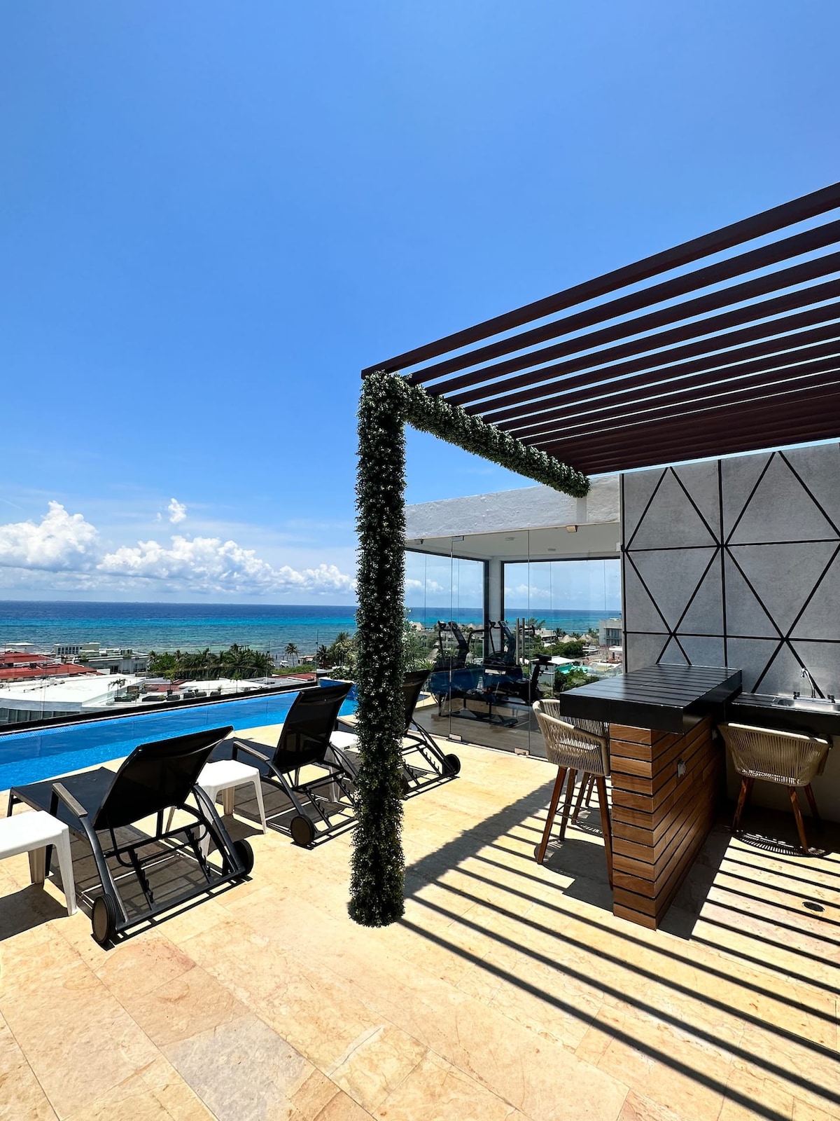 Escapada junto al mar: estudio en la azotea con vistas impresionantes 🌊 ¡Disfrute de lo mejor de Playa! Este moderno estudio en la azotea ofrece vistas impresionantes al mar y una fresca brisa caribeña. Ubicado en la exclusiva zona hotelera (junto al Hyatt Vivid), se encuentra a pocos pasos de la Quinta Avenida. Relájese en su espectacular terraza privada, que cuenta con una bañera al aire libre (a temperatura ambiente) con vistas al mar, ¡ideal para parejas! ⚠️ Nota: El acceso incluye 16 escalones; no es adecuado para huéspedes con problemas de movilidad.