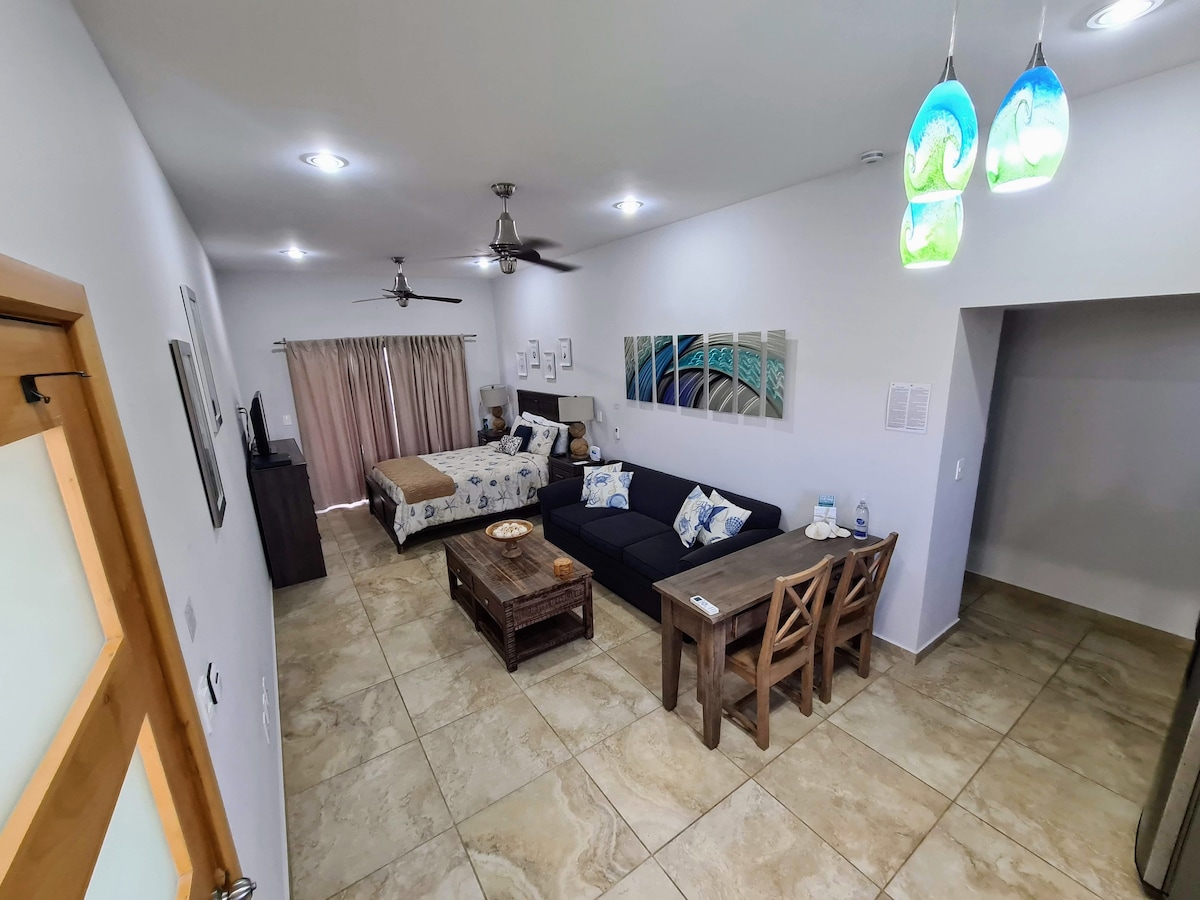 Una unidad privada de 1 dormitorio con cocina, sala de estar y terraza con vistas a la piscina y al mar de Cortés. Mire a mar el dormitorio o la sala de estar, o las ventanas de la cocina. La televisión inteligente de 55 "utiliza la conexión a Internet privada. Un escritorio de altura ajustable en el dormitorio te permite trabajar mientras disfrutas de las vistas de la bahía y la piscina.