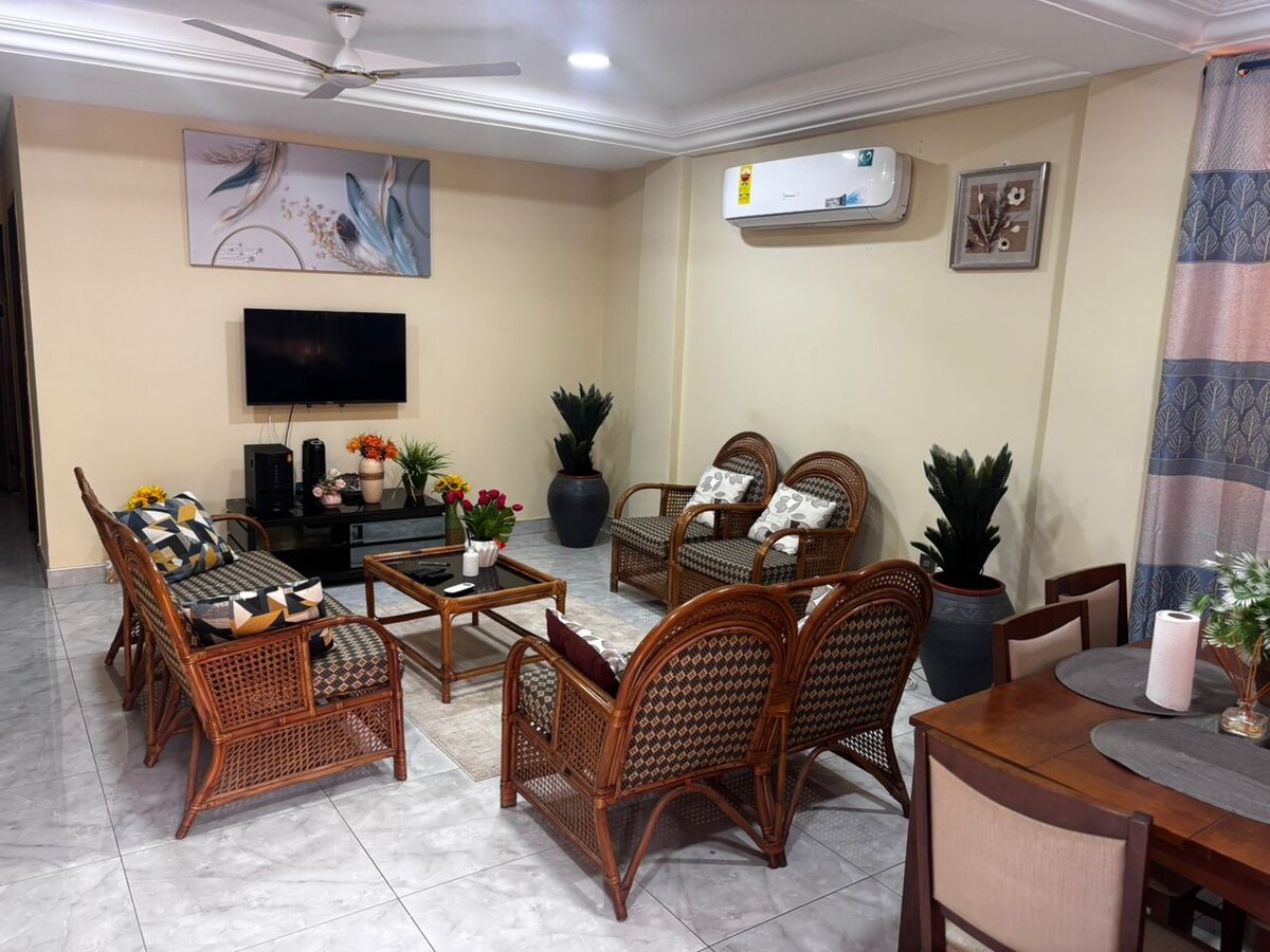 Este apartamento recién amueblado se encuentra muy cerca de las principales atracciones: a 1,4 km de la playa de Labadi, a 4 km de Labone/Cantonment y a 7 km del aeropuerto. El apartamento es muy espacioso; superficie de 140 m2 (1500 pies cuadrados) con 2 balcones, cocina totalmente equipada con lavadora/secadora. Plaza de aparcamiento disponible, barrio seguro y guardia de seguridad para una comodidad total. También hay un conserje en el edificio para ayudar con el equipaje y los recados básicos. ¡No se permiten fiestas! ¡No se permite fumar en interiores!