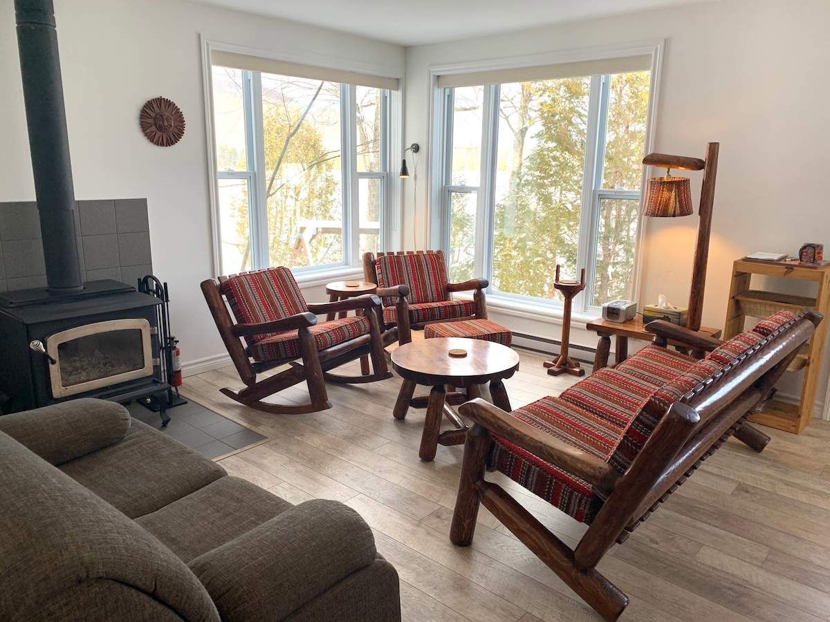 El rifugio es el lugar ideal para refugiarse. Un remanso de paz en plena naturaleza, rodeado de montañas hasta donde alcanza la vista. El Rifugio te ofrece la libertad de establecer un vínculo auténtico con la naturaleza y disfrutar de tiempo de calidad solo o con otros. Tan pronto como entres por la puerta, serás recibido en un ambiente cálido y acogedor. Las grandes ventanas ofrecen una magnífica vista de las montañas circundantes y a lo lejos podemos ver la punta del lago Mégantic.